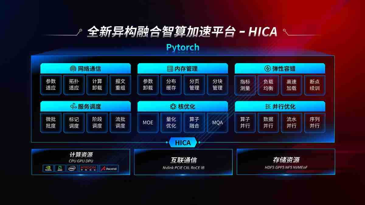 通过自研的服务层、、、、中间适配层、、、、以及调度编排算法,,采用数据并行、、、、模型并行等多种并行方式,,,把并行计算任务进行有效的分解,,,,使其分别由相应的软件栈和算力资源来承接。。当GPU资源变化,,,HICA可以实时动态调度计算子任务并调整模型拓扑和架构,,以充分聚合各种算力资源。。
